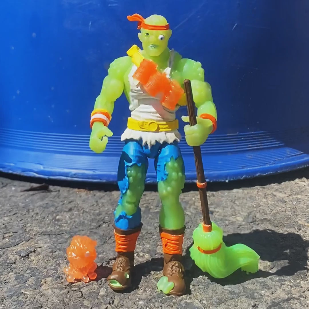 It’s Toxie, like you’ve never seen him before! With translucent green glow-in-the-dark injection and UV reactive color changing paint, this ULTIMATES! figure will have three different looks, as if Toxie is reacting to climate change! His standard appearance features bright neon paint, and in sunlight, Toxie will almost instantly change to an angry red! In the dark, he will glow a menacing green!
