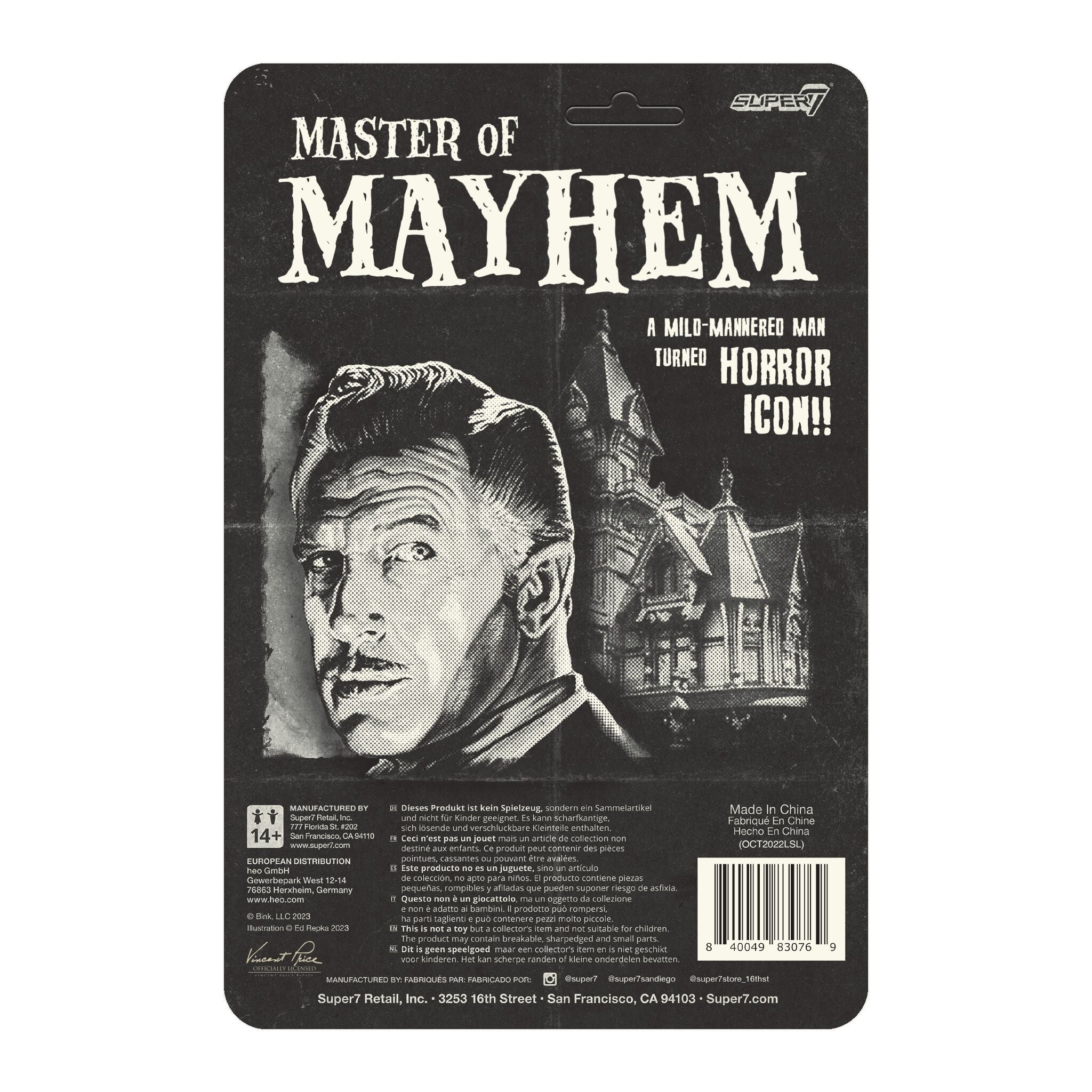 “It’s as much fun to scare as to be scared.” There may not be anyone more synonymous with classic horror than the delightfully devilish Vincent Price. This 3.75” articulated Vincent Price ReAction Figure features the Master of Mayhem, his signature mustache, and a raven accessory all in diabolical vintage horror grayscale. Don’t be the last man on earth to get this Vincent Price ReAction Figure!