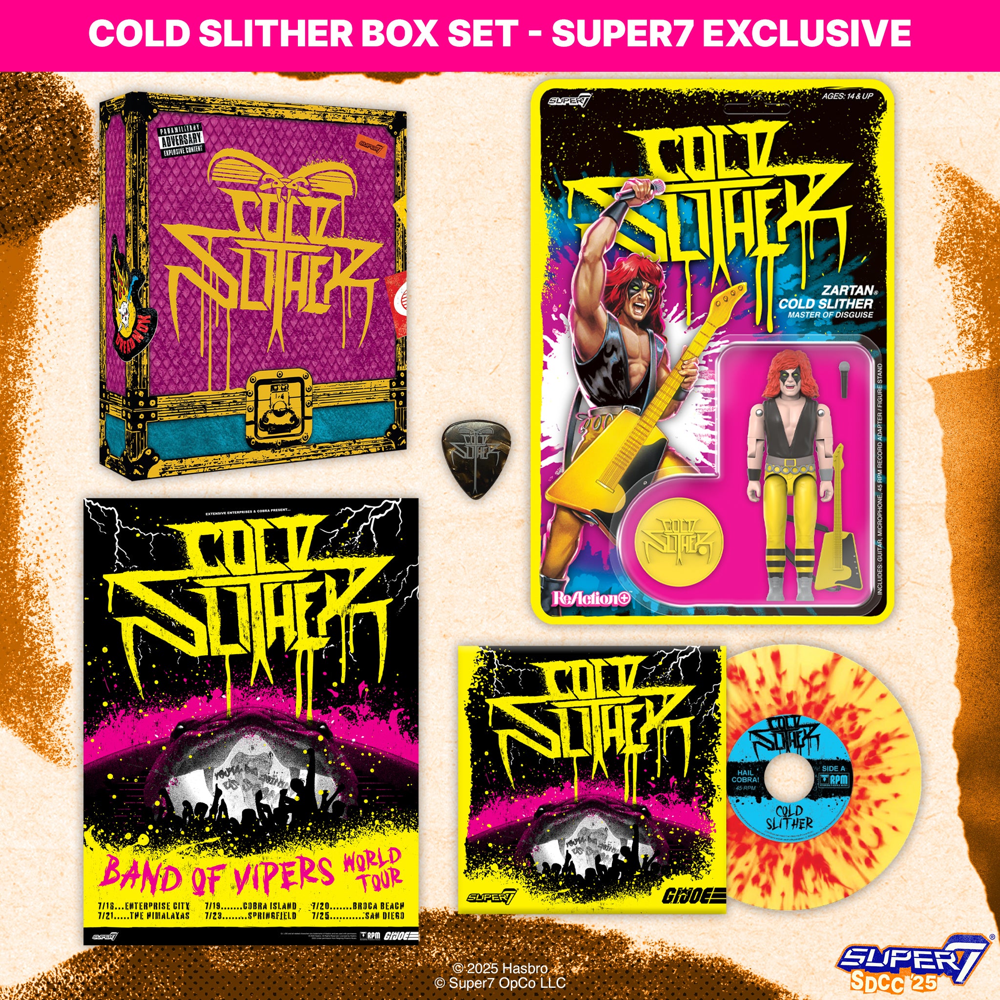 Plus, this box set includes an exclusive 45 record adapter that doubles as a figure stand—complete with the iconic Cold Slither logo imprint—and an exclusive 7" yellow-and-red sunburst vinyl record for the ultimate collectible experience. Packaged on a blistered cardback, this figure is a must-have for any G.I. Joe fan or vinyl enthusiast.