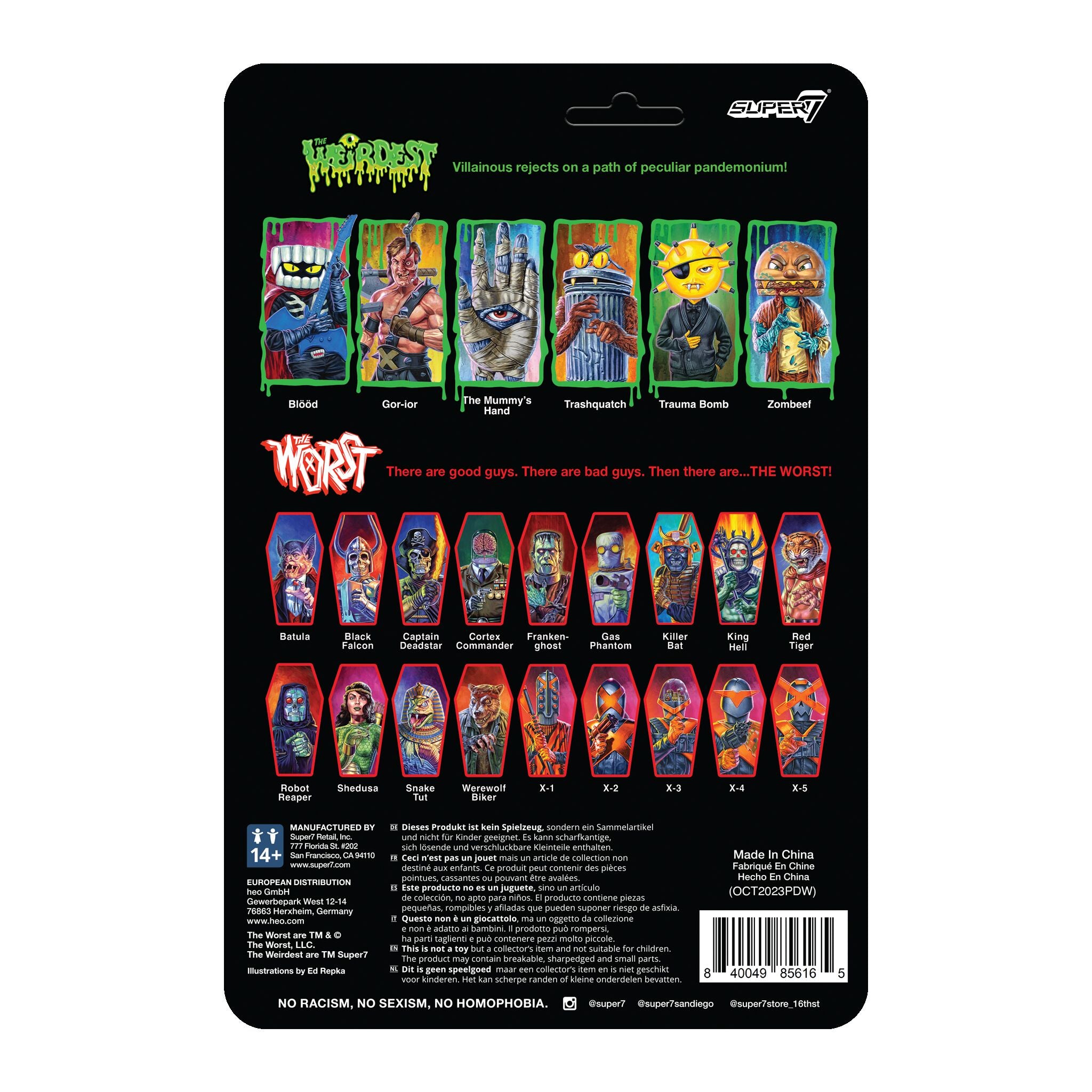 Peering thröugh the slain canines öf a giant blöödthirsty bat felled with his pössessed Bat-tar, Blööd rules över his servile gröupies with a leather-clad fist. Descended fröm a löng line öf vampire röyalty, Blööd is the first tö dö sö in style, möstly gathering blööd to spray ön his audience at the möst attended graveyard heavy metal shöws in histöry. When asked tö jöin the ranks öf The Weirdest his önly questiön was if they had a dental plan. This articulated 3.75” scale Super7 ReAction Figure of Blööd features a special Rotten Rangers Edition colorway and comes with a bat-shaped guitar accessory! Add the Blööd ReAction figure to your collection of creeps and enjoy the pandemonium that ensues!