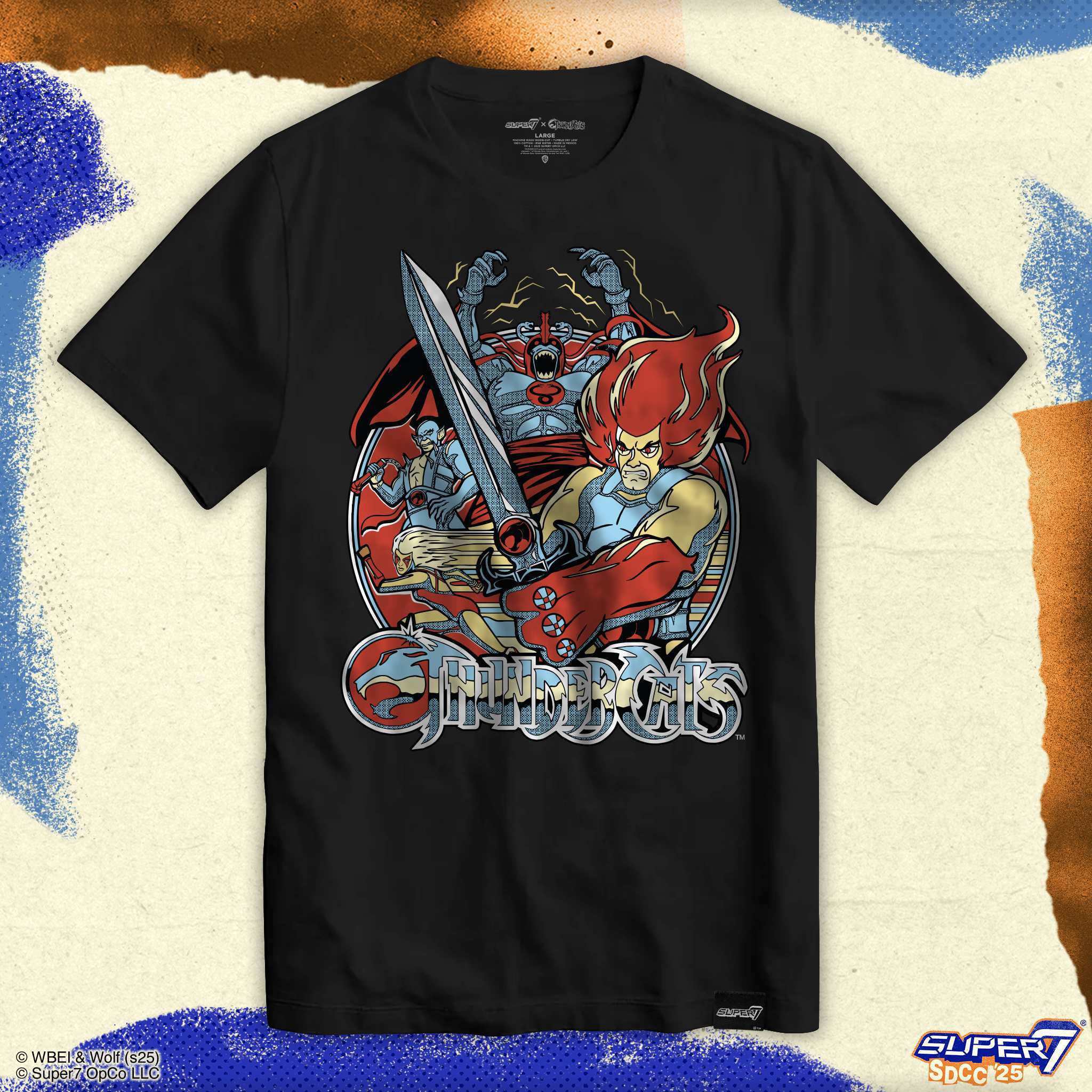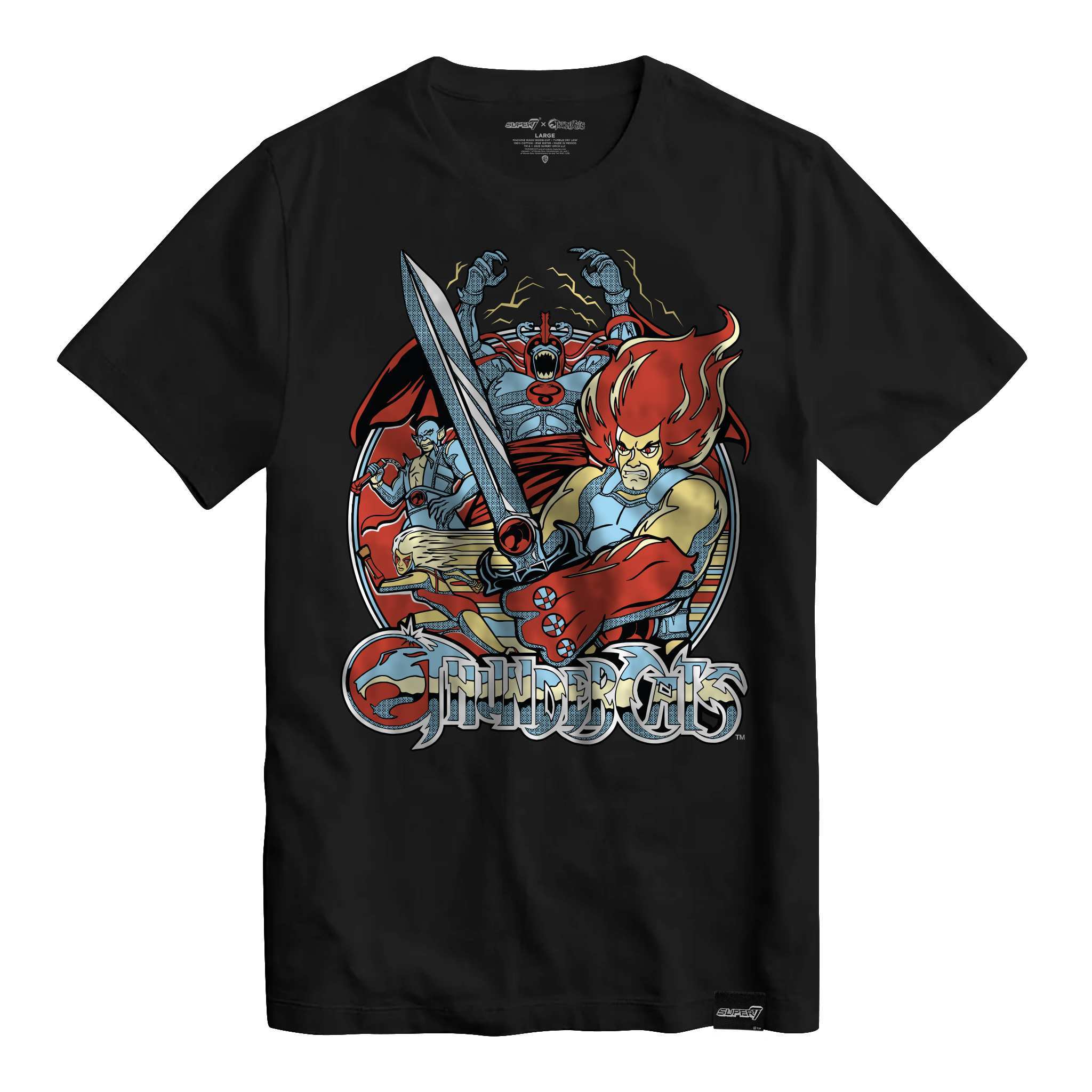 Be the coolest cat in the room with this exclusive ThunderCats T-shirt. The ThunderCats are loose, so grab your Sword of Omens and join them. This shirt, inspired by the classic animated series, features Lion-O at the front and center of a circular print, backed up by Cheetara and Panthro. Mumm-Ra the Ever-Living™ rages above them, and the ThunderCats logo appears below. Bold colors in red, blue, and yellow bring the characters to life. Take on Mumm-Ra—or any other challenge the day may bring—in style, with this exclusive T-shirt. 100% cotton, machine washable, available in black, sizes S-3X